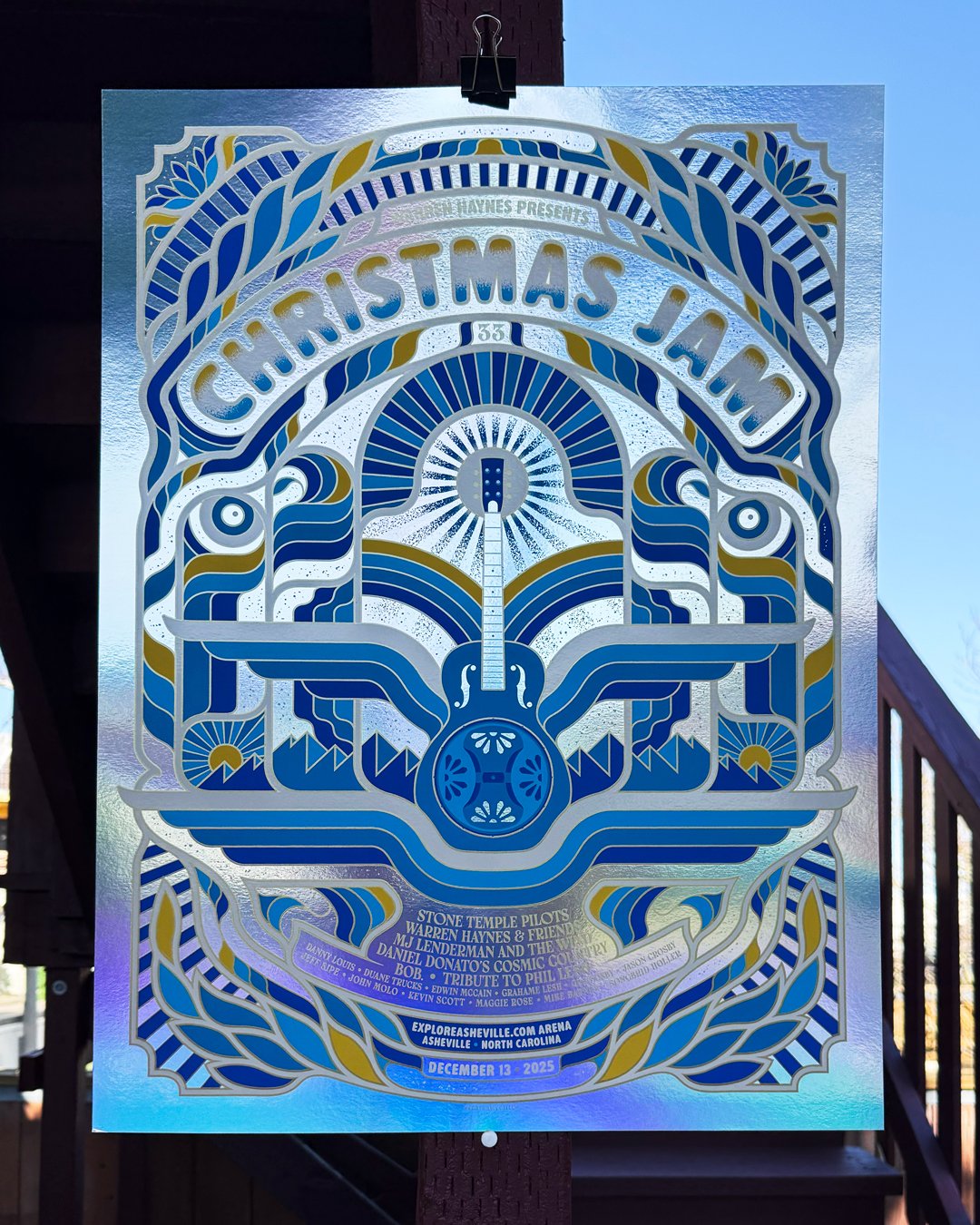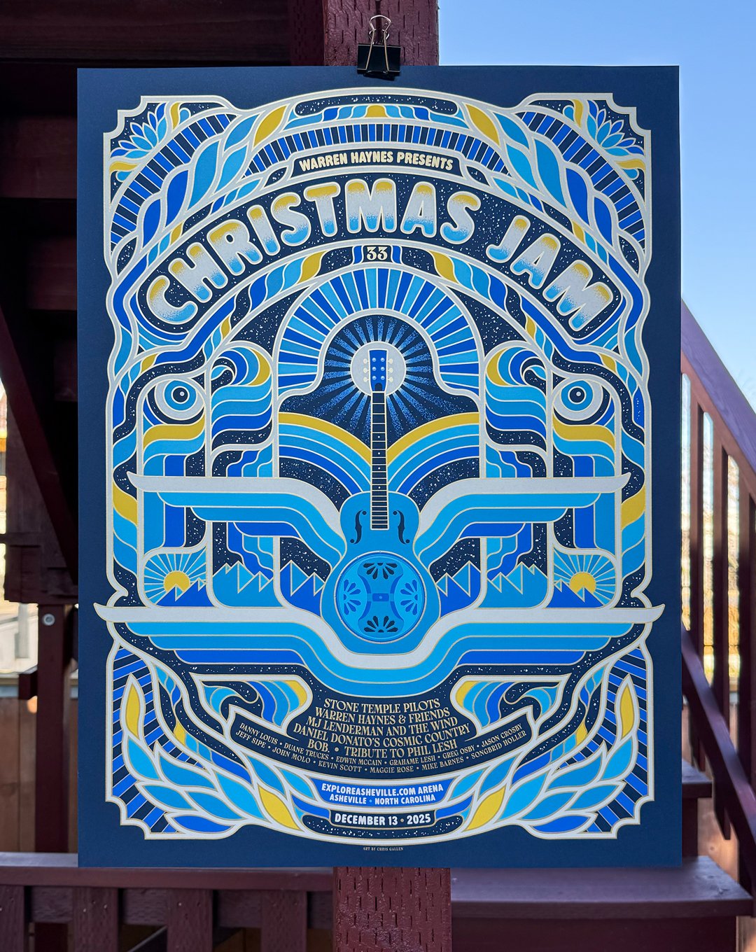 18"x24" 6-Color Screen Prints for Warren Haynes' Christmas Jam 2025. Printed on Neenah 'Patriot Blue' Stock, with Metallic Gold ink. Variant on Rainbow Foil. Signed+Numbered AP Edition, extremely limited run. Printed by Baker Prints.